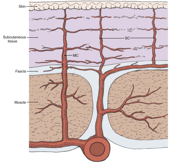 - Both septocutaneous and musculocutaneous arteries end in a diffuse dermal and subdermal plexus. This diffuse, interconnecting network provides a redundancy in vascular supply in the skin.