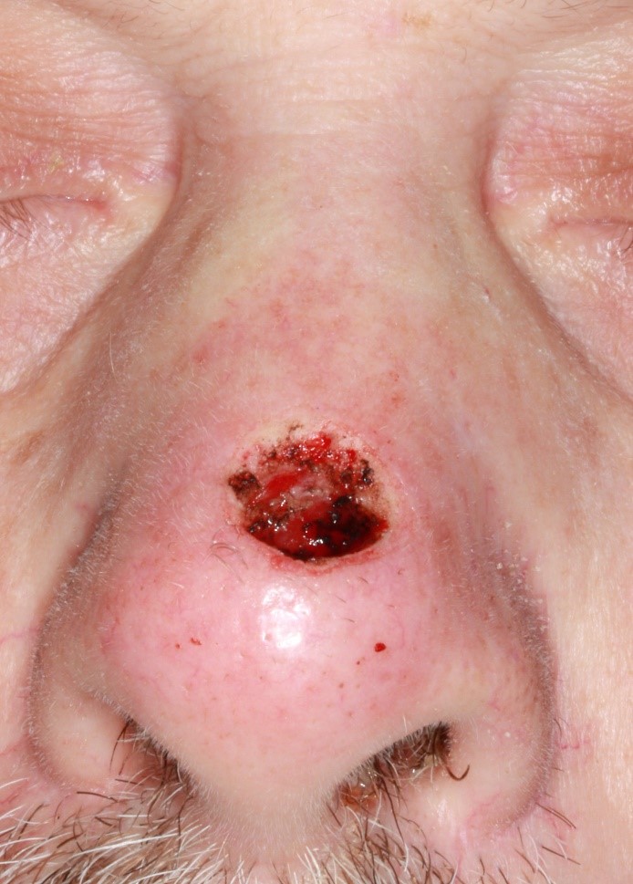 - A patient presents from the Mohs surgeon with an 8mm skin-only, circular defect of the nasal supratip.