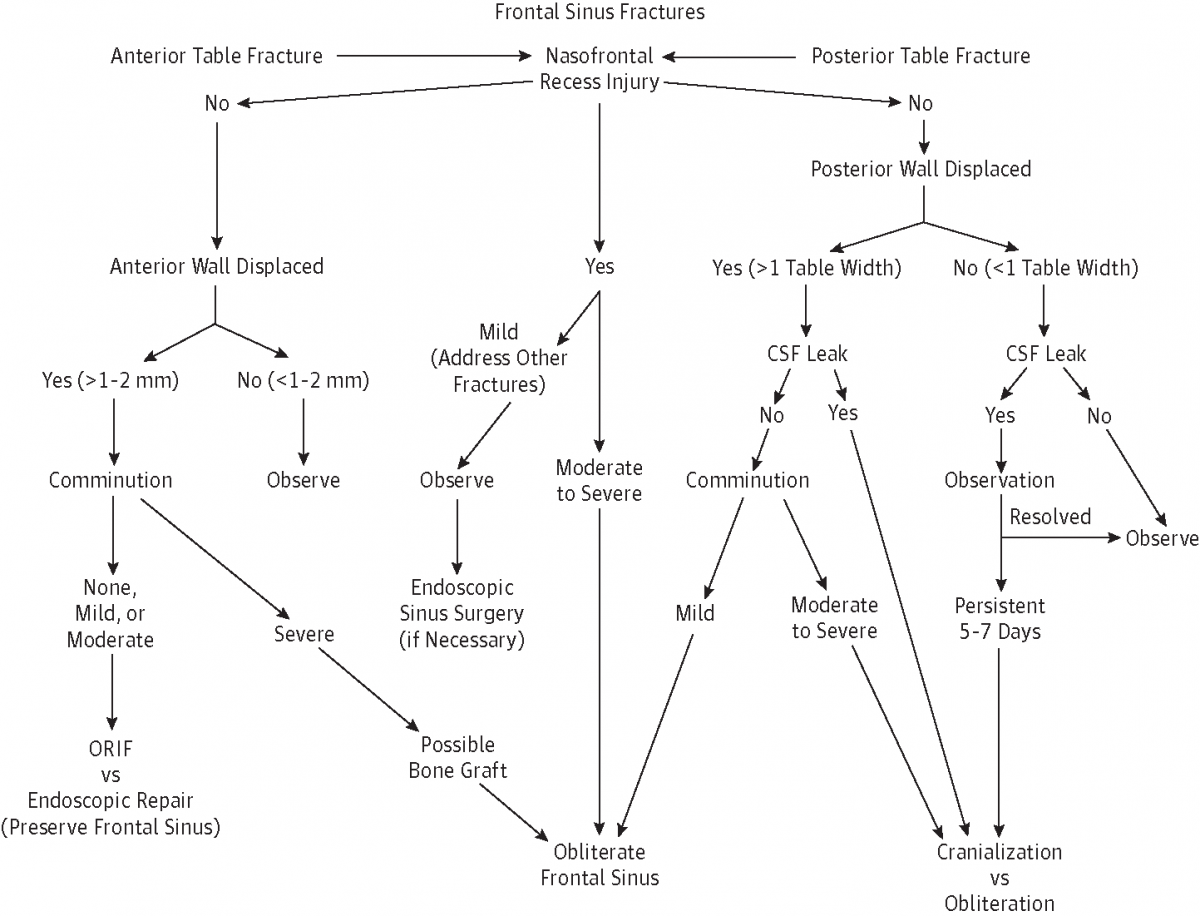 Treatment of frontal sinus fractures can be conservative (non-operative) or surgical (open approach vs endoscopic). The appropriate treatment is dictated by the anatomic cite of injury, the suspected patency of the nasofrontal duct and the other patient co-morbidities such as CSF leak. A reasonable approach using a decision-making algorithmic tree was published by Pawar and Rhee taking into account these variables.