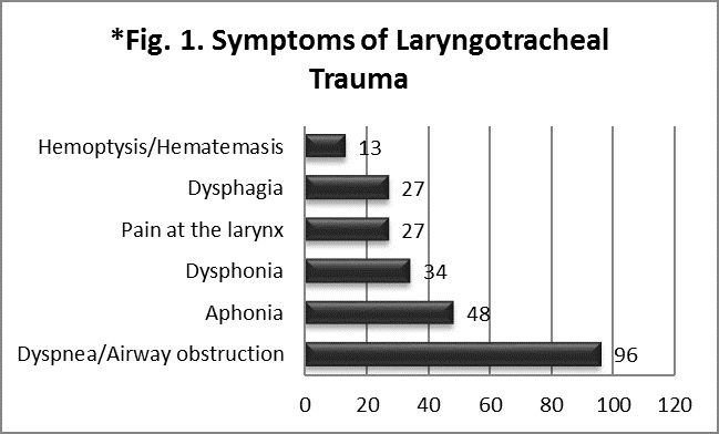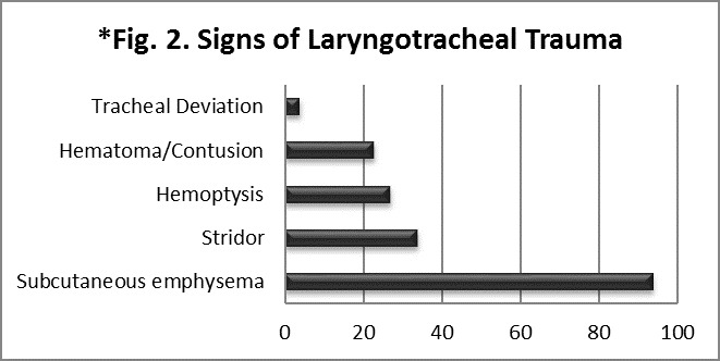 - Civilian Data: In 2006, Verschueren et al. published their results of a 12-year review at tertiary care center. Of 16,465 patients who had head, neck, or facial injuries, 37 had laryngeal fractures (0.2%). Of those, 85% were caused by blunt trauma, and 96% of those also had maxillofacial trauma. Of the 27 with available records, 8 (29%) required open reduction and internal fixation (ORIF) of the laryngeal fracture and 2 (7%) required a stent. Attempting to determine if mechanism altered the pattern of injury, Stassen et al. analyzed 15 patients with a laryngeal injury in a civilian trauma center. Fully 60% had blunt trauma, and 88% of those were due to MVA. Blunt trauma was twice as likely to cause isolated laryngeal trauma without injury to the trachea, while penetrating trauma was more balanced.