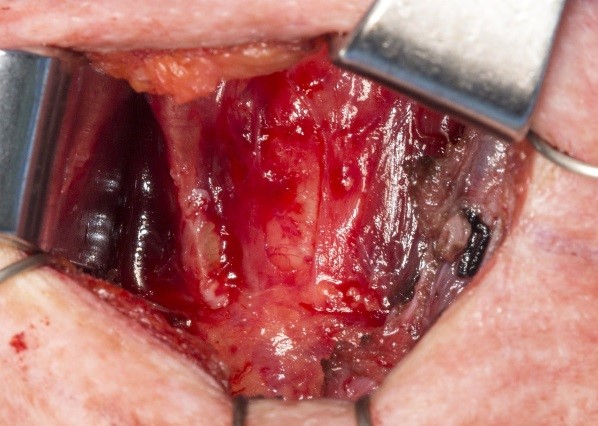 A 52 year old woman was injured in a motorcycle accident.Among her other injuries, she had a displaced right thyroid ala fracture. Direct laryngoscopy demonstrated diffuse edema and moderate ecchymosis. Intraoperative photographs show displaced right paramendian fracture, with subsequent exposure, realignment, and repair. The 10-hole plate allowed more than two points of fixation on either side of the fracture. Although difficult to appreciate in the photo, the plate is bent the most between the left-most sets of screws, and the larynx is being rotated to the left for the picture.
