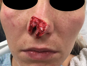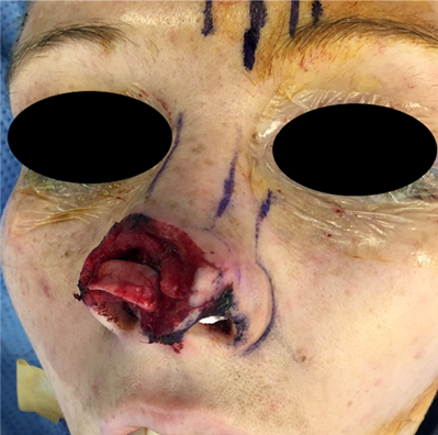 She underwent a multilayer reconstruction with bipedicled nasal mucosa graft for internal lining, alar rim graft from auricular cartilage (see intraoperative figure below), and a paramedian forehead flap.
