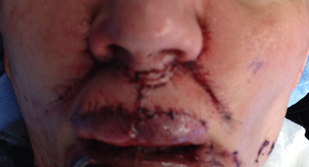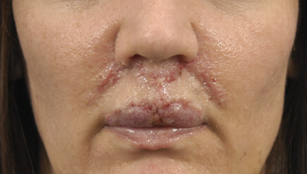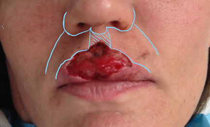 Reconstruction performed with bilateral inferiorly based transposition melolabial flaps, mucosal advancement flap, and cheek advancement.